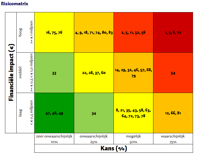 De overige 39 risico's zijn verspreid over de oranje-, gele- en groene zones. De kans van optreden varieert tussen de 10% en 75% in combinatie met een laag- tot hoge financiële impact afhankelijk van het kans percentage.