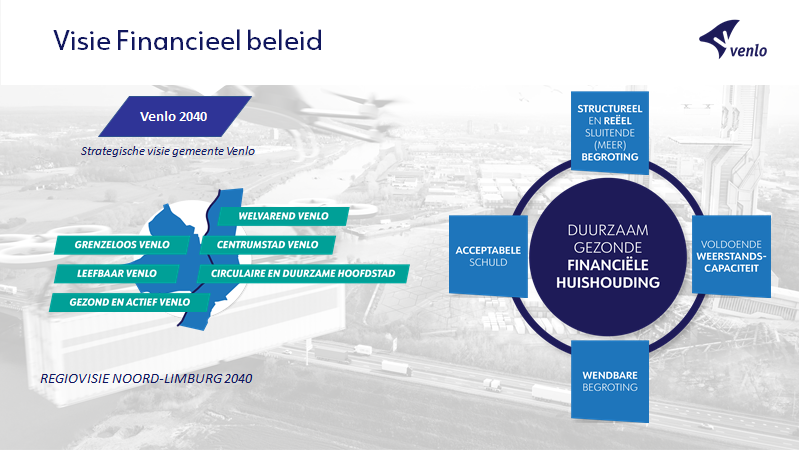 Anders dan veel andere Nederlandse gemeenten kent de gemeente Venlo geen majeure ombuigingsnoodzaak om tot een financieel sluitende begroting te komen. Onze financiële kengetallen zijn aan de maat, het financieel meerjarenbeeld sluitend. Dankzij de maatregelen die in de huidige en de daaraan voorafgaande bestuursperiode zijn genomen. Het zijn deze maatregelen die het ons nu mogelijk maken om ingezet beleid te continueren en noodzakelijk onderhoud en voorziene investeringen van middelen te voorzien.
